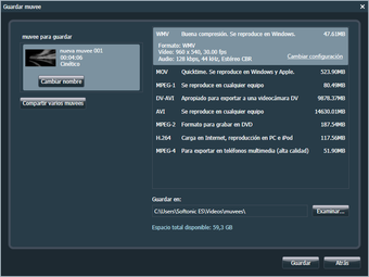 En este caso Muvee Reveal X te muestra los formatos de salida disponibles: WMV, MOV, MPEG-1, DV-AVI, AVI, MPEG-2, H.264 o MPEG-4. Podrás cambiar el aspecto y la calidad del audio y del vídeo.