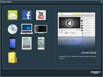 Guardar el vídeo resultante es muy fácil. Basta con elegir el medio de salida: Muvee Cloud, Facebook, YouTube, DVD, PC, HD, dispositivo móvil, iPad o iPhone. Otra opción es personalizar los parámetros, para usuarios avanzados.
